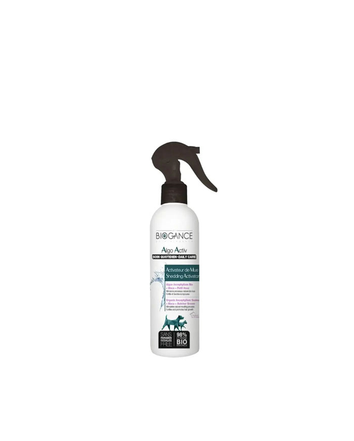 Sprej za negu krzna psa brenda Biogance. Biogance sprej koji stimulativnim i regeneracijskim svojstvom ubrzava prirodan proces linjanja i podstiče rast dlake. Njegova PH izbalansirana i formula bez parabena, obogaćena organskom braon morskom travom, makom i kostrikom podstiču opadanje mrtve dlake , obnavljanje nove i njeno jačanje. Ne sadrži parabone, fenokietanole, životinjska ulja i veštačke boje. Efikasni i prirodni proizvodi neguju krzno ljubimaca i smanjuju rizik od nastanka alergija.