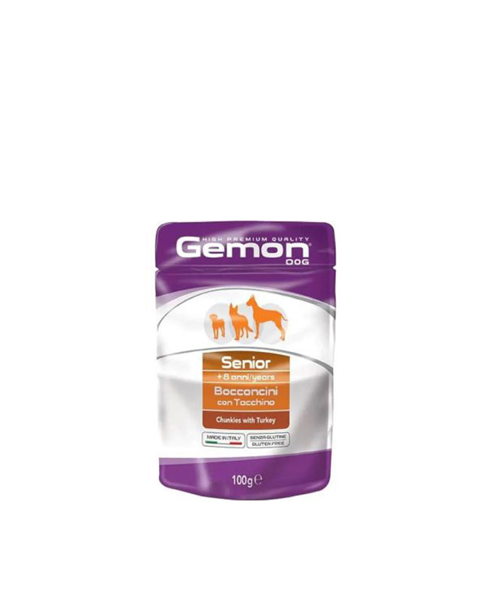 Mokra hrana za pse brenda Monge. Gemon hrana za odrasle pse svih rasa sa Ćuretinom je kompletna hrana za senior pse svih veličina, formulisana da obezbedi sve neophodne hranljive materije za svakodnevnu vitalnost naših četvoronožnih prijatelja. Gemon je linija kompletne hrane za kućne ljubimce formulisane od kvalitetnih sastojaka, odabranih da zadovolje nutritivne potrebe pasa. Veoma ukusne recepte prilagođene različitim uzrastima i načinima života. Bez dodatih veštačkih boja ili konzervansa. Proizvedeno u Italiji.