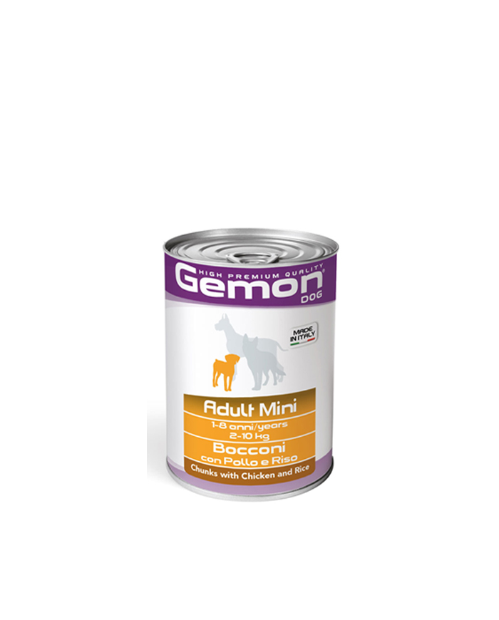 Mokra hrana za pse brenda Monge. Monge konzerva Gemon Dog Adult sa Piletinom. Komadići piletine sa pirinčem, kompletna hrana za odrasle pse male veličine, uzrasta od 1 do 8 godina.
