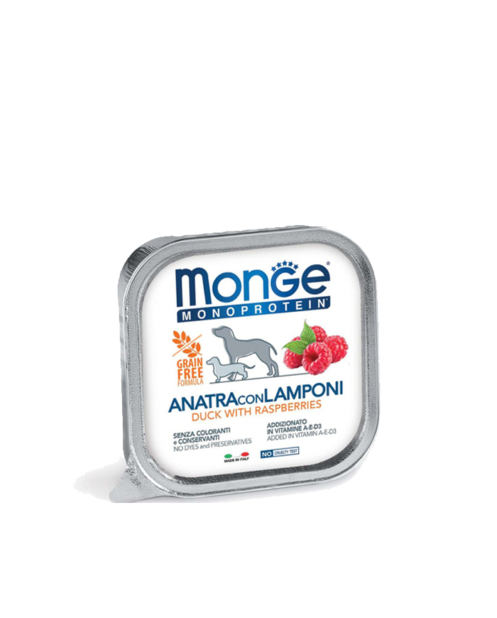 Pašteta za pse brenda Monge. Ova pašteta sa jednim izvorom proteina, biće pravo zadovoljstvo za pse zahvaljujući upotrebi svežeg mesa najvišeg kvaliteta i prisustvu sastojaka posebno odabranih zbog njihovih nutritivnih svojstava. Monge Monoproteinska pašteta je napravljena od samo jednog izvora životinjskih proteina, odabrane patke najvišeg kvaliteta sa dodatkom voća, prirodnog izvora vitamina i minerala. Uravnotežena hrana koja sadrži vitamin A, E-D3 i esencijalne elemente u tragovima. Prirodni sastav bez dodatih boja, konzervansa ili šećera.