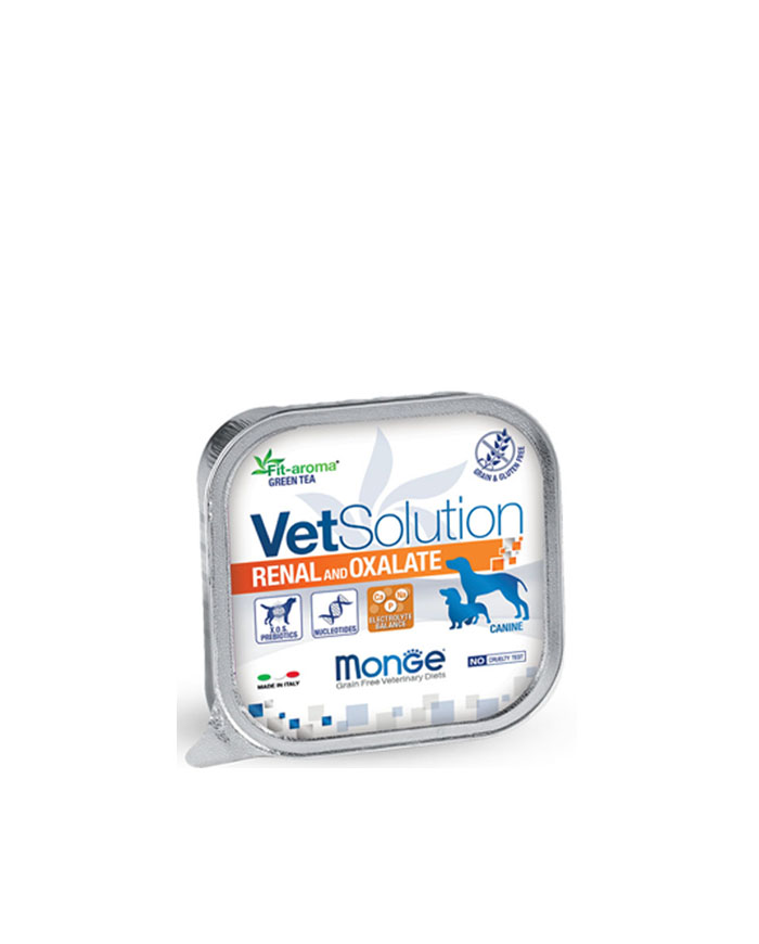 Pašteta za pse brenda Monge. Monge Renal/Oxalate je kompletna dijetetska hrana za pse formulisana za podršku bubrežne funkcije u slučaju hronične ili privremene bubrežne insuficijencije. Takođe je formulisana za smanjenje formiranja oksalatnih kamenaca. Sadrži koncentrat soka od dinje za neutralizaciju slobodnih radikala i zeleni čaj za podršku radu bubrega.