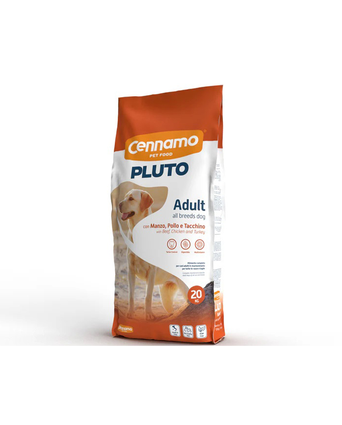 Suva hrana za pse brenda Cennamo. Cennamo Pluto Dog Adult 24/10 je potpuna hrana za odrasle pse svih veličina. Dizajniran i formulisan za subjekte sa srednjom/intenzivnom dnevnom fizičkom aktivnošću. Pluton Dog Adult predstavlja kompletnu i uravnoteženu dnevnu ishranu.