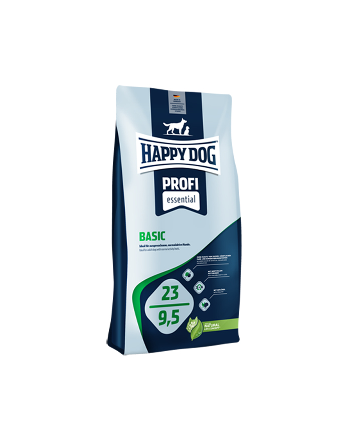 Suva hrana za pse brenda Happy Dog. Happy Dog Profi Line Basic Adult je kompletna hrana za sve rase odraslih pasa kojima je potrebna normalna količina energije. Osnovna hrana obezbeđuje uravnoteženu količinu proteina i energije kako bi se zadovoljile nutritivne potrebe radnih, sportskih ili pasa za uzgoj tokom njihove smanjene fizičke aktivnosti ili van reproduktivnog ciklusa. Sadrži samo umerene količine hranljivih materija kako bi se izbeglo nepotrebno prehranivanje pasa i nepotrebno opterećenje unutrašnjih organa. Međutim, sadrži sve potrebne minerale, elemente u tragovima i vitamine u proporcijama optimizovanim za pse pod nedovoljnim opterećenjem. Stoga je ova hrana ekonomična opcija za zdravu ishranu pasa, ako su zadovoljeni samo osnovni zahtevi za snabdevanje hranljivim materijama. Vredni životinjski proteini koji se koriste u hrani, bez upotrebe soje ili drugih ekstrakata biljnih proteina, kao i visokokvalitetne komponente žitarica u proizvodu osiguravaju popularnost proizvoda i visok nivo tolerancije.