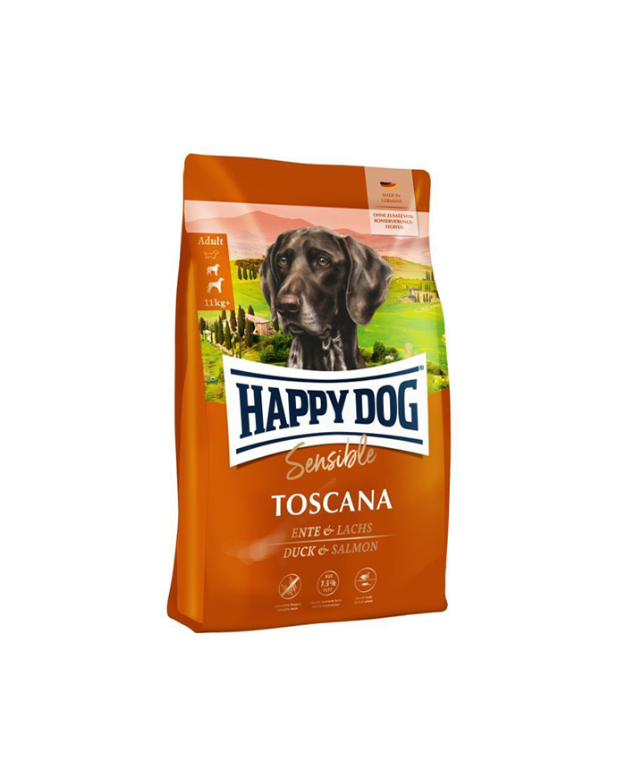 Suva hrana za pse brenda Happy Dog. Happy Dog Toscana Supreme Adult je hrana sa smanjenim sadržaj masti, idealan za pse sa niskim energetskim potrebama, takođe pogodan za sterilisane pse. Sa patkom, lososom, crvenim vinom, prirodnim maslinovim uljem i odabranim mediteranskim biljem. Jedinstveni oblik prirodnih sastojaka Happy Dog Supreme LifePlus Concept® upotpunjuje ekskluzivnu formulu kompletne suve hrane super premium kvaliteta. Zahvaljujući ovim posebnim elementima i posebnom procesu proizvodnje, Toskana je pogodna i za osetljive pse sa posebnim potrebama. Sa umerenim sadržajem masti od 7.5% i 24% proteina, izuzetno je pogodan za pse sa niskim energetskim potrebama i normalnim potrebama za proteinima, kao i za sterilisane pse.