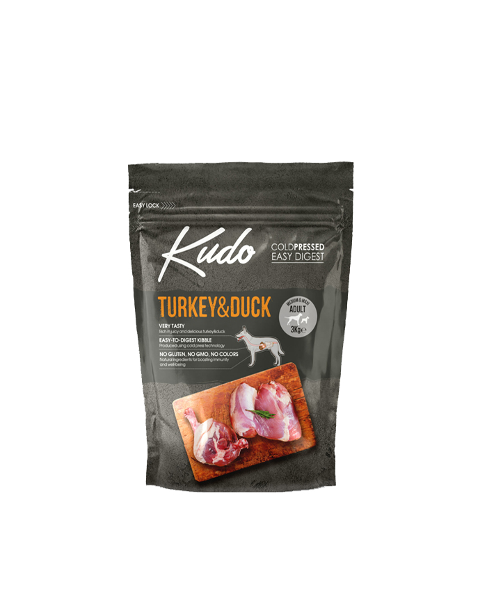 Suva hrana za pse brenda Kudo. Kudo hrana Medium/Maxi Adult Ćuretina&Pačetina dostupna u pakovanju od 3kg, predstavlja vrhunsku ishranu za vaše odrasle pse. Formula bogata ćuretinom i pačetinom osigurava sve neophodne nutrijente za održavanje zdravog i aktivnog načina života pasa. Ova specijalizovana hrana zadovoljava sve nutritivne zahteve pasa srednjih i velikih rasa, obezbeđujući im uravnoteženu ishranu koja je jednako ukusna koliko i korisna.