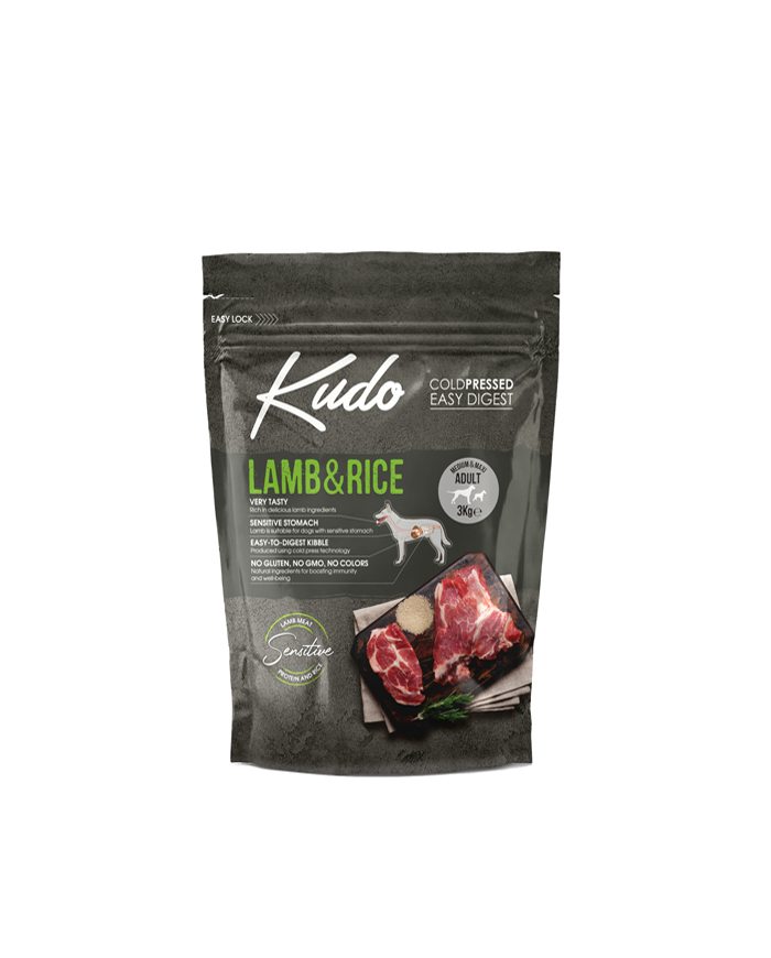 Suva hrana za pse brenda Kudo. Kudo hrana Medium/Maxi Adult Jagnjetina sa Pirinčem predstavlja kompletan obrok za odrasle pse srednjih i velikih rasa.
