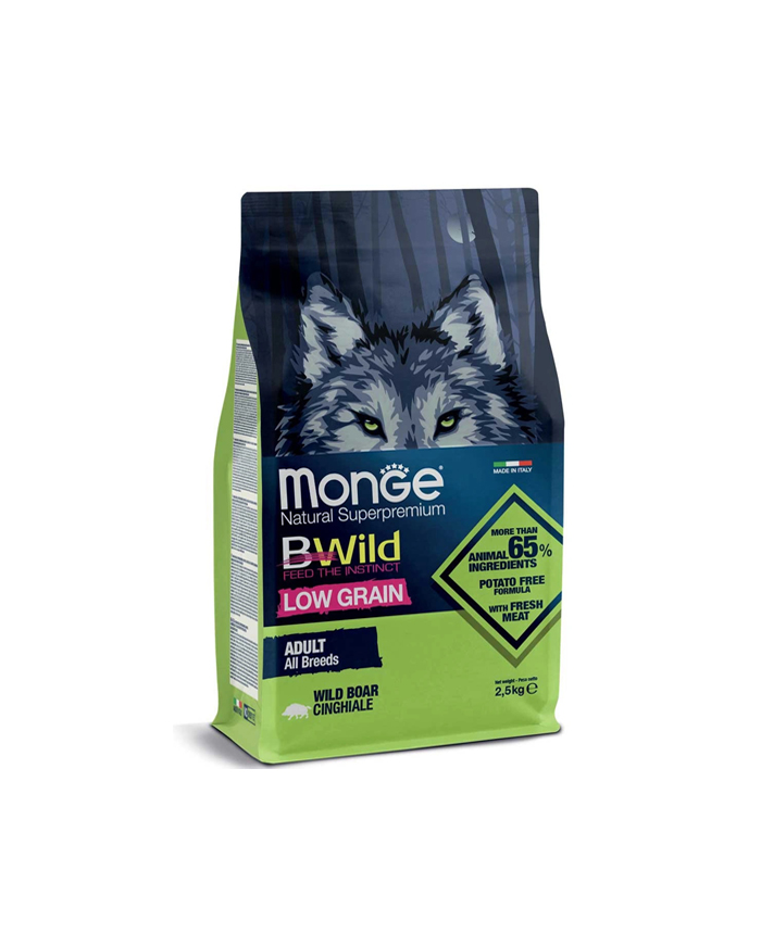 Suva hrana za pse brenda Monge. Kompletna i uravnotežena hrana za odrasle pse. Divlja svinja, za sve rase je kompletna i uravnotežena hrana za odrasle pse. Visok sadržaj životinjskog proteina iz mesa divlje svinje garantuje izbalansiranu ishranu za rast vaše ljubimce, sledeći njihov prirodni instinkt. Recept je formulisan sa niskim nivoom žitarica i ne sadrži krompir. Laneno seme, izvor masnih kiselina omega-3, doprinosi mekoj i sjajnoj dlaci. Prefinjeni ukus je takođe pojačan voćem (poput borovnice, brusnice i maline) i povrćem (šargarepa), prirodnim izvorima vlakana i minerala. Recept je obogaćen XOS (ksilo-oligosaharidi), poslednjom generacijom prebiotika, koji održavaju zdravlje creva. Specifični recept osigurava dobrobit životinje i poštuje njen prirodni instinkt. Bez veštačkih boja i konzervansa.