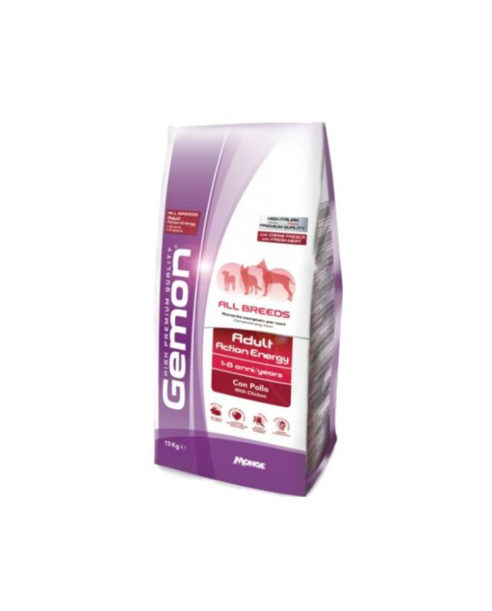 Suva hrana za pse brenda Monge. Gemon Adult sa Piletinom je kompletna hrana sa piletinom namenjena za svakodnevno hranjenje odraslih pasa. Sa laganim i lako svarljivim sastojcima, ova hrana sadrži L-karnitin koji jača cirkulaciju. Pored toga, njegova formula obezbeđuje celodnevnu energiju, čak i za najaktivnije pse. Sastav ove hrane uključuje žitarice, meso i nusproizvode od mesa u količini od 30%, pri čemu je minimalno 15% sveže piletine. Ulja i masti takođe su deo sastava, zajedno sa povrćem poput pulpe cvekle i pivskog kvasca. Dodatak minerala, ekstrakta kestena, yucca schidigera, holin hlorida i fruktooligosaharida F.O.S. doprinose opštem zdravlju i dobrobiti vašeg psa. Bez dodanih boja i veštačkih konzervansa.