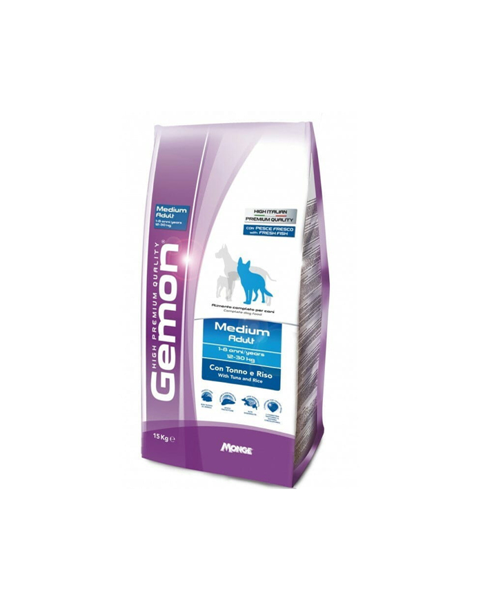 Suva hrana za pse brenda Monge. Gemon Medium Adult sa Tunom i Pirinčem je kompletna hrana za odrasle pse srednjih veličina. Formulaciju karakterišu kvalitetni sastojci kao što su tunjevina, izvor esencijalnih hranljivih materija, i pirinač, izvor ugljenih hidrata, koji su veoma svarljivi kroz proces ekstruzije. Uravnotežena ishrana sa prebioticima, kao što su fruktooligosaharidi (FOS), i pulpa cvekle, izvor nerastvorljivih vlakana, za pravilnost crevnog trakta. Sadrži svežu ribu za optimalan ukus i L-karnitin za podršku mišićne mase. Takođe je formulisan sa jukom šidigerom za kontrolu crevnih mirisa. Bez dodanih boja i veštačkih konzervansa.