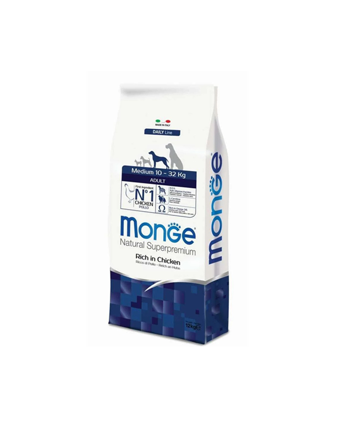 Suva hrana za pse brenda Monge. Monge Natural SuperPremium Medium sa Piletinom kompletna je hrana za odrasle pse srednje veličine. Garantuje sreću vašeg psa zahvaljujući vrlo kvalitetnim hranljivim materijama, koje su rezultat dugogodišnjeg italijanskog istraživanja. Glavni sastojak je piletina i obogaćeni su XOS (ksilo-oligosaharidi), poslednjom generacijom prebiotika, koji održavaju zdravlje creva. L-karnitin čuva srce i osigurava optimalnu težinu, a bogati su Omega 3/6 za zdravu kožu i dlaku. Bez dodatih veštačkih boja ili konzervansa.