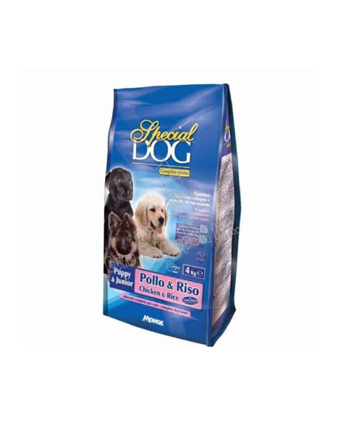 Suva hrana za pse brenda Monge. Monge Special SuperPremium Puppy&Junior hranljiva i lako svarljiva hrana za uravnoteženu ishranu. Visok sadržaj proteina iz piletine i ugljenih hidrata iz pirinča čini ovaj proizvod visoko svarljivim, zadovoljavajući visoke energetske potrebe za zdrav razvoj u ključnim prvim mesecima rasta. Pravilan odnos kalcijuma i fosfora, neophodan za zdrave mišiće i zube, zajedno sa svim korišćenim sirovim sastojcima, od odlične ribe do prebiotika kao što su FOS (fruktooligosaharidi) i Juka čidigera (koja smanjuje miris stolice), čine ovaj proizvod vrhunskom podrškom za zdrav rast vašeg šteneta. Takođe sadrži holin hlorid, koji pomaže varenju masti i štiti jetru. Obezbeđuje optimalan odnos omega-3 i omega-6 masnih kiselina za mladalačku kožu. Bez dodanih boja i veštačkih konzervansa.