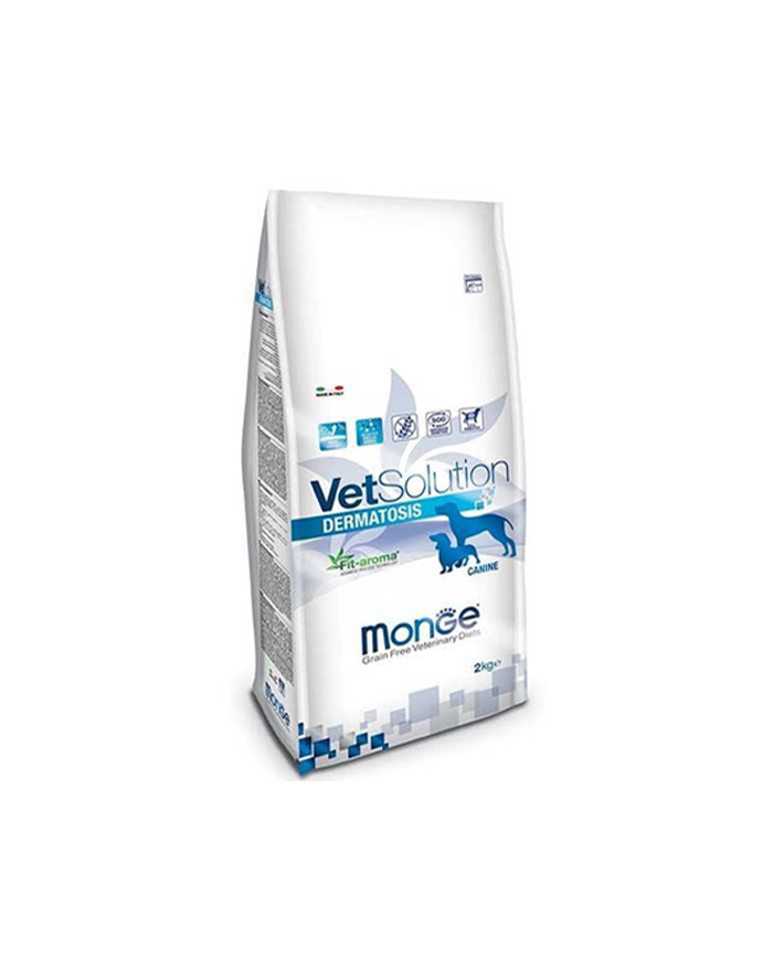 Suva hrana za pse brenda Monge. Monge Vetsolution Dermatosis Canin je kompletna dijetetska hrana formulisana da podrži funkciju kože u slučaju dermatoze i prekomernog gubitka dlake kod pasa. Monge Vetsolution Dermatosis sadrži superoksid dismutazu (SOD) za sprečavanje oksidativnog stresa, aloe veru za poboljšanje zdravlja kože, ksilooligosaharide (KSOS) za očuvanje crevne mikrobiote, a formulacija se karakteriše visokom koncentracijom esencijalnih masnih kiselina za pružanje podrške kožnim oboljenjima.