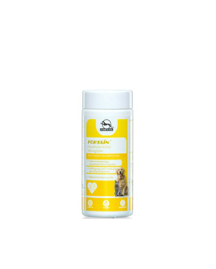 Suplement za pse brenda Fortain. Fortain od 80g je vrhunski suplement namenjen za podršku imunološkom sistemu tvog psa. Ovaj proizvod sadrži esencijalne vitamine i minerale koji pomažu u jačanju otpornosti i poboljšanju ukupnog zdravlja tvog ljubimca. Fortain je idealan za sve životne dobi pasa, uključujući štence, odrasle pse i starije pse, kao i pse u periodu oporavka od bolesti. Uravnotežen nivo proteina je neophodan za mnoge procese u telu pasa i mačaka od formiranja kože, dlake i kandži do obezbeđivanja uravnotežene dnevne ishrane. Suplement pruža koncentrovani izvor životinjskih proteina koji se može uključiti u ishranu na različite načine.