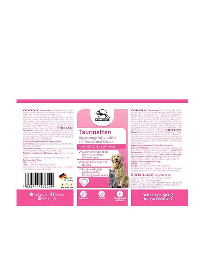 Suplement za pse brenda Fortain. Fortain Taurinetten od 150 tableta su suplementi bogati taurinom i esencijalnim vitaminima, dizajnirani da podrže zdravlje tvog psa. Taurin je ključan za zdravlje srca, vida i opšteg blagostanja pasa. Ove tablete su idealne za sve životne dobi, od štenaca do starijih pasa, posebno za one koji imaju povećane potrebe za taurinom.