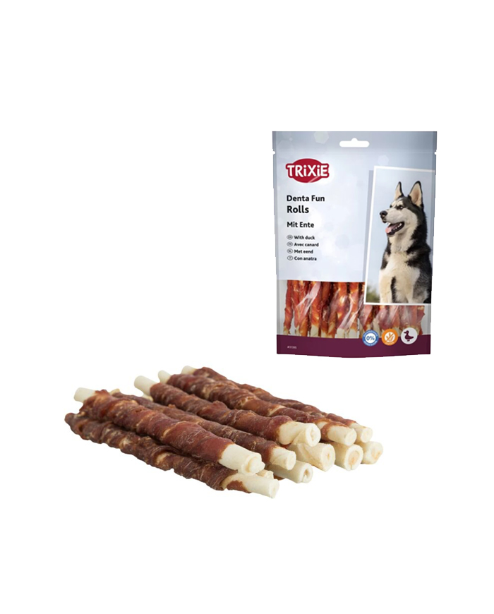 Poslastica za pse brenda Trixie. Većina pasa voli žvakanje. Napravljeno od kravlje kože sa valjanim pačjim filetima. Kao užina između obroka. Čuvati na hladnom i suvom mestu. Ostavite posudu sa svežom vodom na raspolaganju.